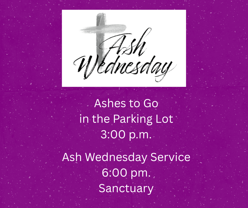Wednesday, February 18 – “Ashes-to-Go” from 3:00-3:45 p.m. in the parking lot; 4 p.m. Vestry meeting; Ash Wednesday service in the Sanctuary at 6 p.m.