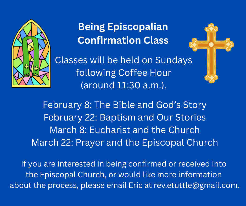 Sunday, February 8 – Service of Holy Eucharist at 10 a.m., Coffee Hour and Adult Formation/Confirmation class to follow
