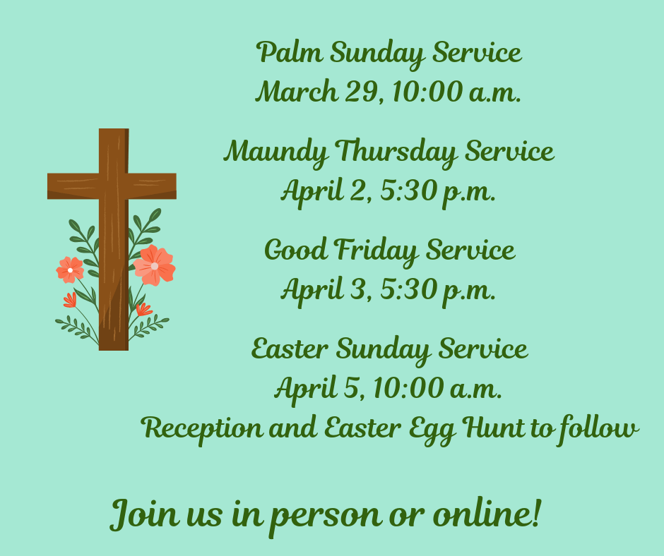 Sunday, March 29 – Palm Sunday service at 10 a.m.; 5th Sunday Luncheon to follow