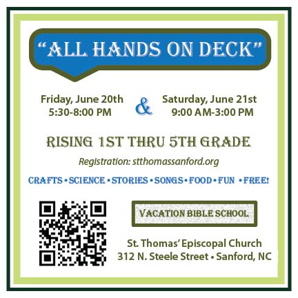 “All hands on deck!” Vacation Bible School will be held at St. Thomas’ on Friday, June 20 and Saturday, June 21. We invite your children, grandchildren, and friends’ children to join our adventure ‘sailing the sea’ and learning how we each can make a difference in the world. The Friday session from 5:30 p.m. to 8 p.m. will be for the whole family; the Saturday session from 9 a.m. to 3 p.m. will be for children in grades 1st-5th. Please put VBS on your calendars!
