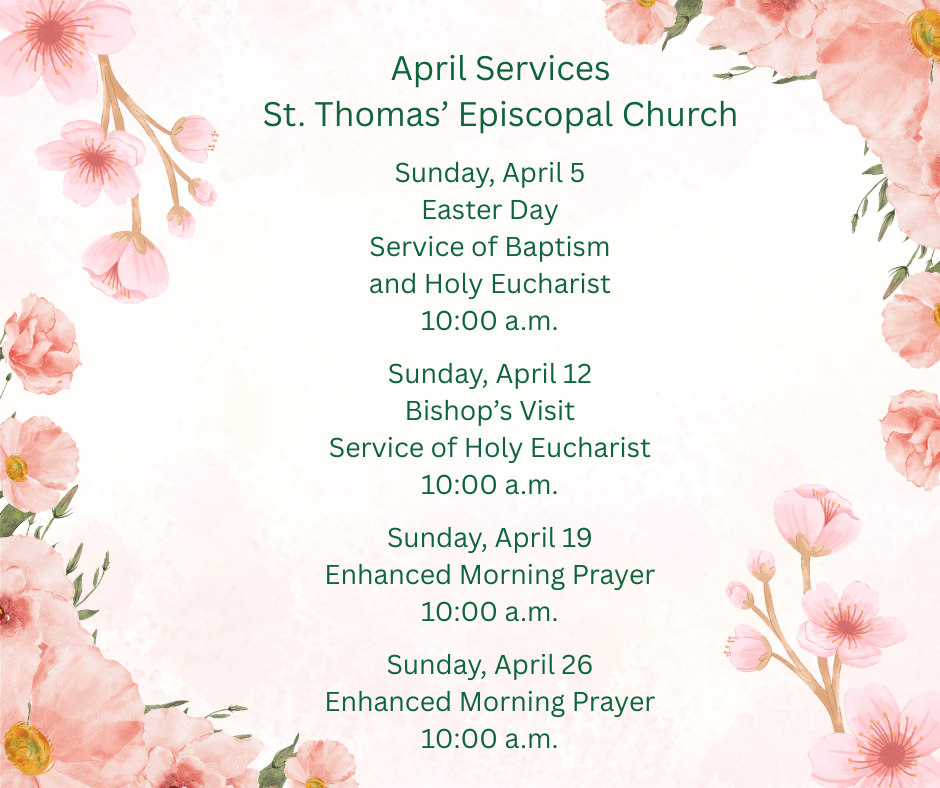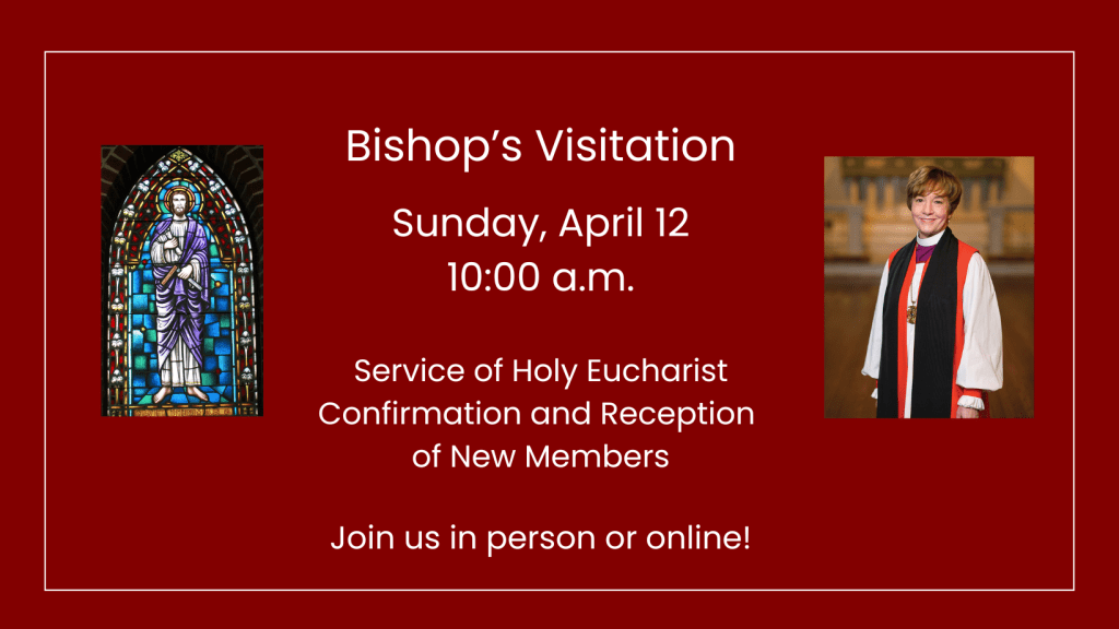 Sunday, April 12 – Bishop’s Visit/Service of Holy Eucharist at 10 a.m.; Coffee Hour to follow